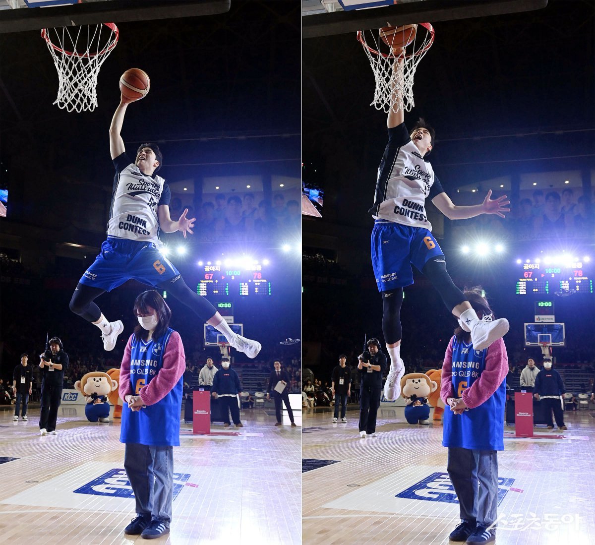 19일 부산 사직체육관에서 ‘2024-2025 KCC 프로농구 올스타전’ 경기가 열렸다. 덩크 콘테스트 결승전에 참가한 삼성 조준희가 팬을 뛰어 넘는 덩크슛을 하고 있다. 부산 | 김민성 기자 marineboy@donga.com