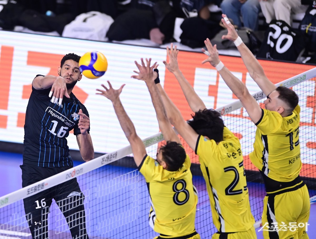 19일 천안종합운동장 유관순체육관에서 열린 ‘도드람 2024-2025 V리그’ 남자부 천안 현대캐피탈과 의정부 KB손해보험의 경기에서 현대캐피탈 레오가 KB손해보험 블로커 앞에서 스파이크를 하고 있다. 천안 | 주현희 기자 teth1147@donga.com
