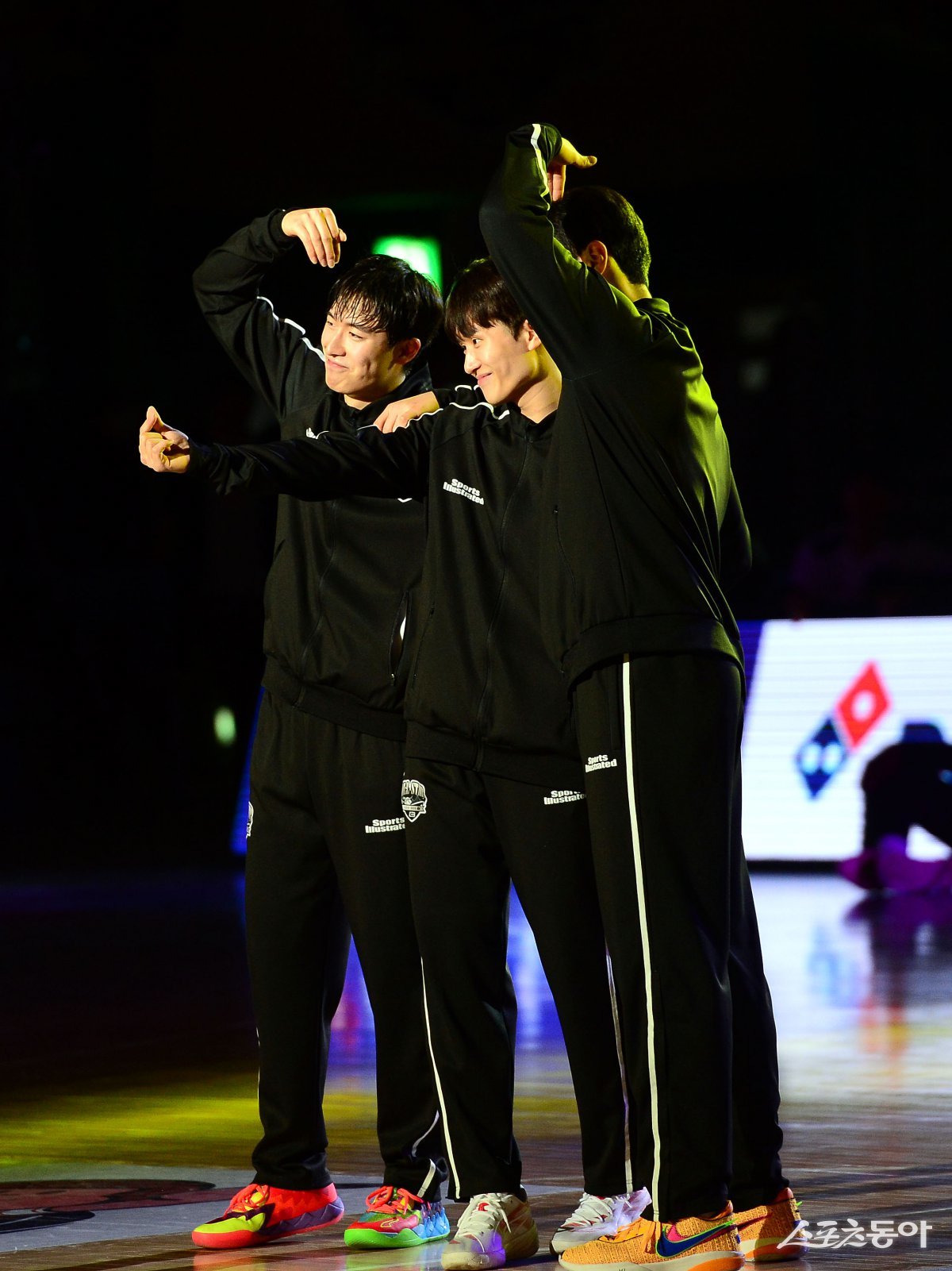 19일 부산 사직체육관에서 ‘2024-2025 KCC 프로농구 올스타전’ 경기가 열렸다. 양준석, 박무빈, 문정현이 댄스를 선보이고 있다. 부산 | 김민성 기자 marineboy@donga.com