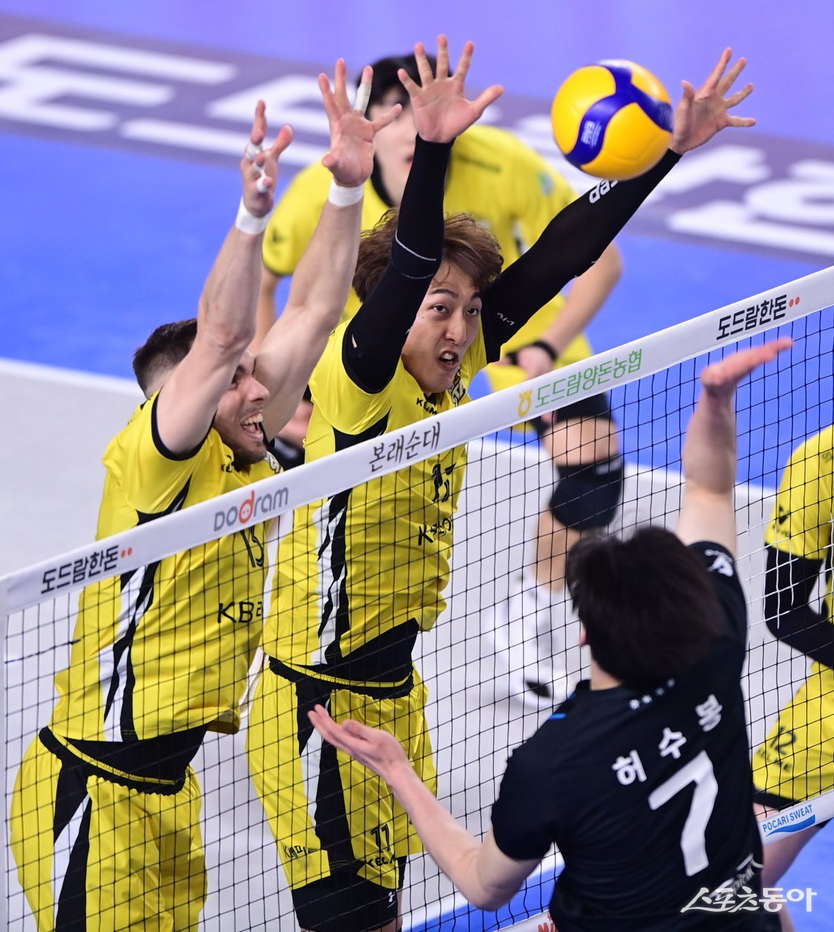 19일 천안종합운동장 유관순체육관에서 열린 ‘도드람 2024-2025 V리그’ 남자부 천안 현대캐피탈과 의정부 KB손해보험의 경기에서 KB손해보험 차영석이 블로킹을 하고 있다. 천안 | 주현희 기자 teth1147@donga.com