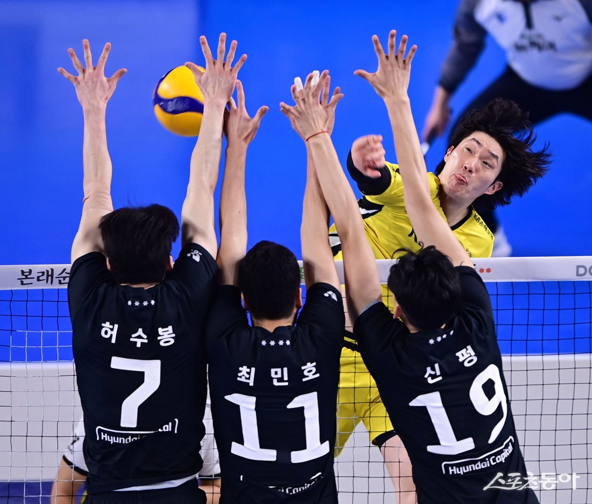 19일 천안종합운동장 유관순체육관에서 열린 ‘도드람 2024-2025 V리그’ 남자부 천안 현대캐피탈과 의정부 KB손해보험의 경기에서 KB손해보험 황경민이 현대캐피탈 블로커 앞에서 스파이크를 하고 있다. 천안 | 주현희 기자 teth1147@donga.com