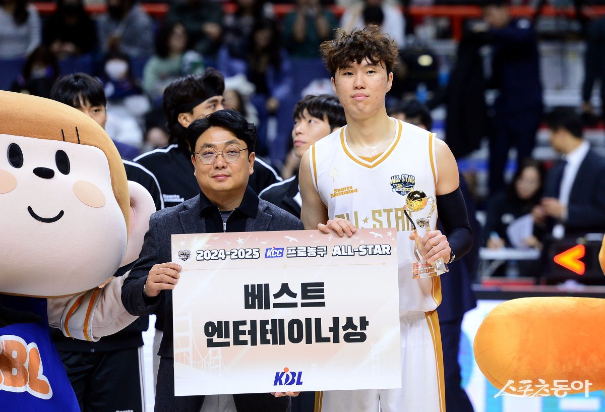 19일 부산 사직체육관에서 ‘2024-2025 KCC 프로농구 올스타전’ 경기가 열렸다. 경기 종료 후 베스트 엔터테이너상을 수상한 이우석이 기념촬영을 하고 있다. 부산 | 김민성 기자 marineboy@donga.com