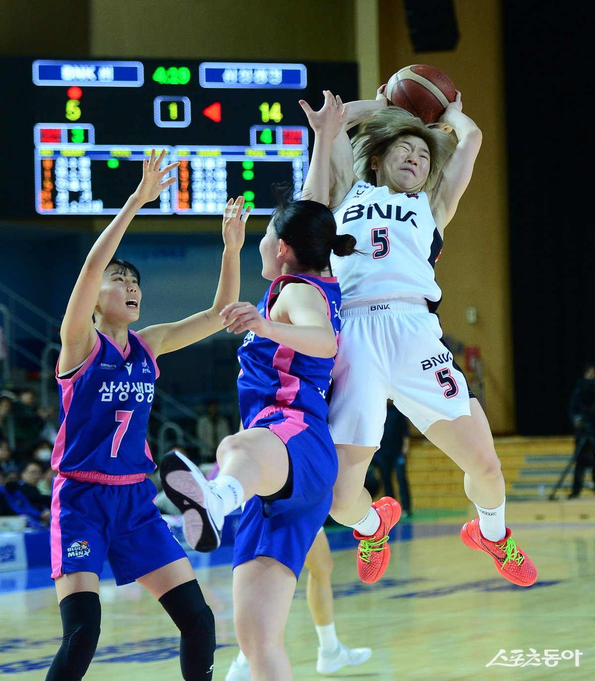 19일 용인체육관에서 열린 ‘하나은행 2024~25 여자프로농구’ 삼성생명과 BNK 썸 경기에서 BNK 썸 안혜지가 리바운드 볼을 잡고 있다. 용인 | 김종원 기자 won@donga.com