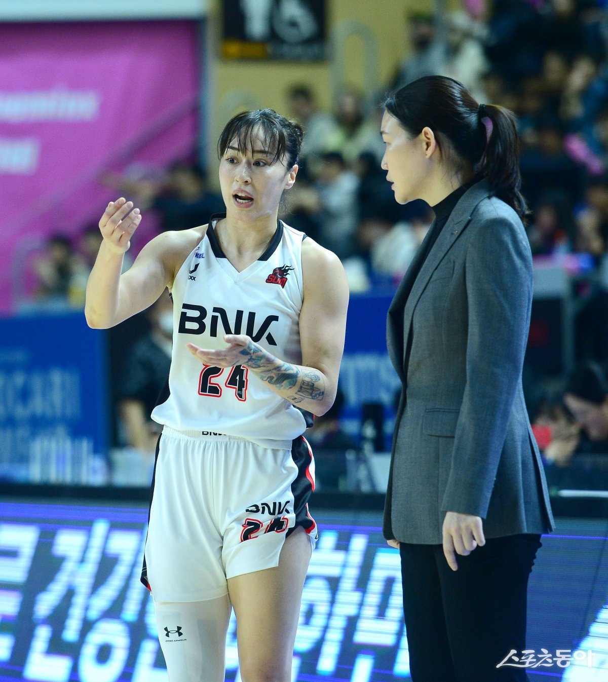 19일 용인체육관에서 열린 ‘하나은행 2024~25 여자프로농구’ 삼성생명과 BNK 썸 경기에서 BNK 썸 김소니아가 박정은 감독과 이야기하고 있다. 용인 | 김종원 기자 won@donga.com