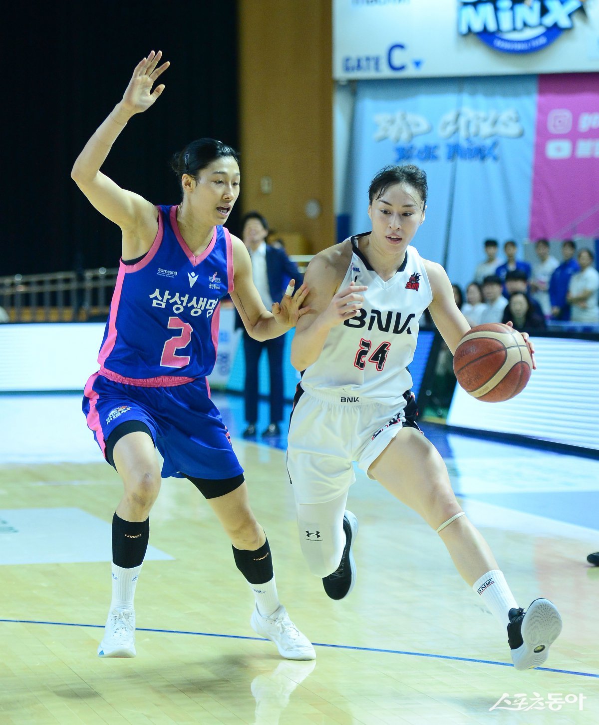 19일 용인체육관에서 열린 ‘하나은행 2024~25 여자프로농구’ 삼성생명과 BNK 썸 경기에서 BNK 썸 김소니아가 삼성생명의 수비를 뚫고 골밑을 공격하고 있다. 용인 | 김종원 기자 won@donga.com