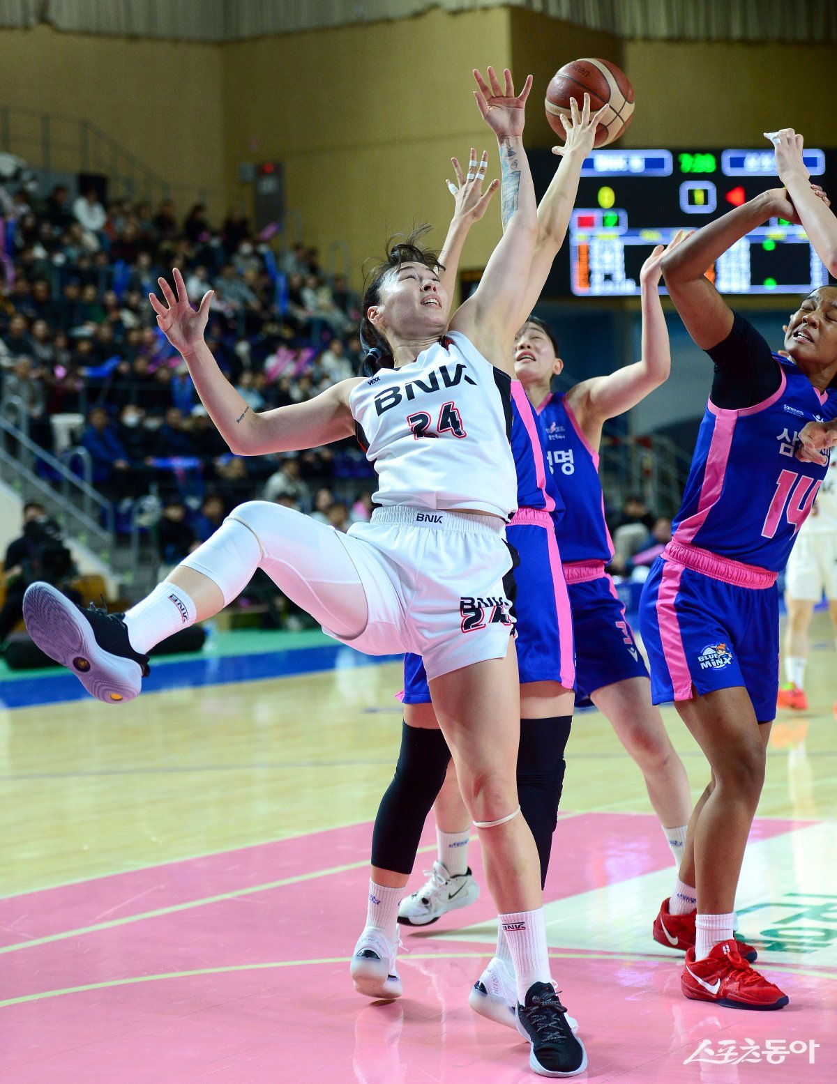 19일 용인체육관에서 열린 ‘하나은행 2024~25 여자프로농구’ 삼성생명과 BNK 썸 경기에서 BNK 썸 김소니아와 삼성생명 키아나 스미스가 리바운드 볼을 다투고 있다. 용인 | 김종원 기자 won@donga.com