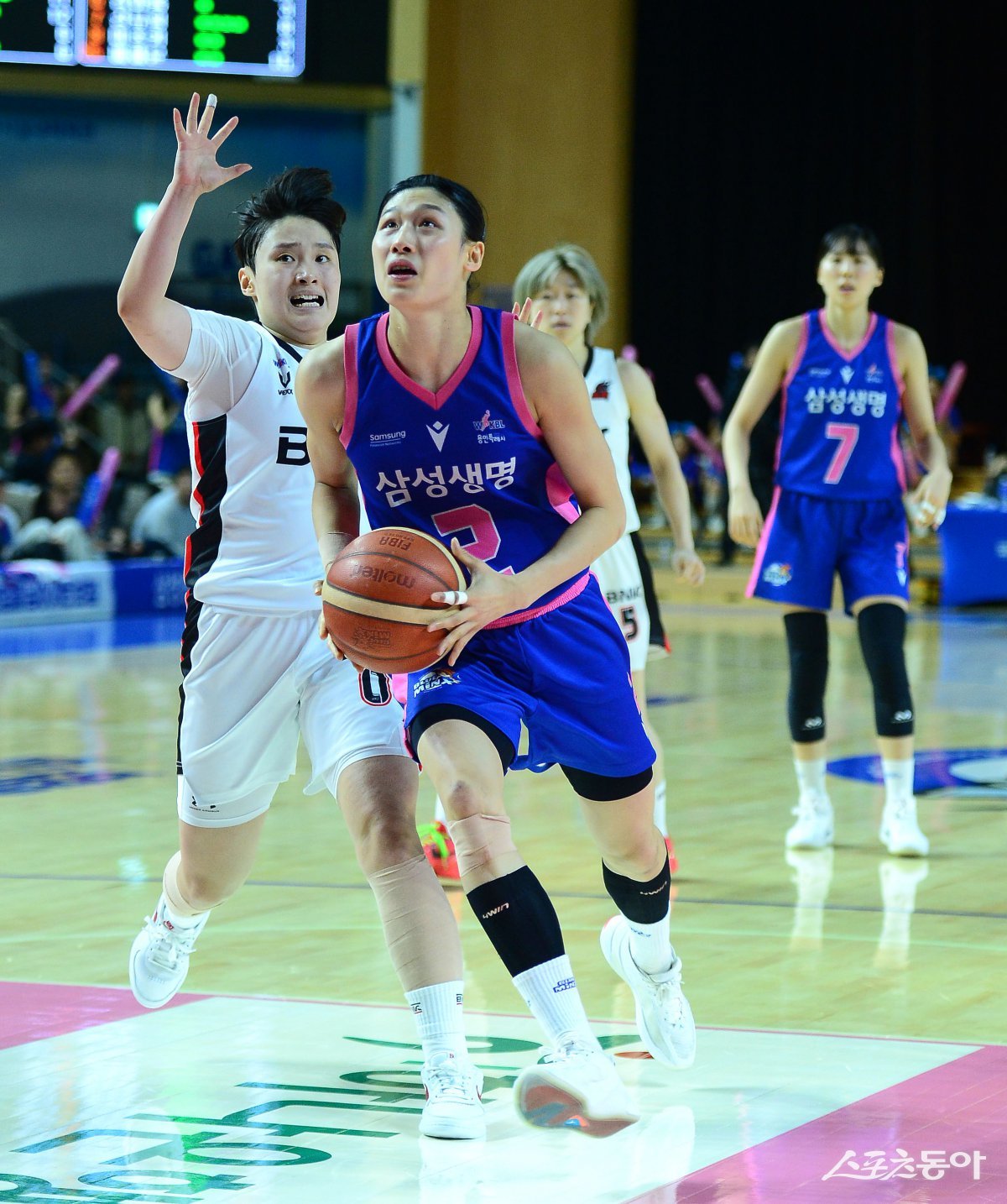 19일 용인체육관에서 열린 ‘하나은행 2024~25 여자프로농구’ 삼성생명과 BNK 썸 경기에서 삼성생명 이해란이 BNK 썸의 수비를 뚫고 골밑을 공격하고 있다. 용인 | 김종원 기자 won@donga.com