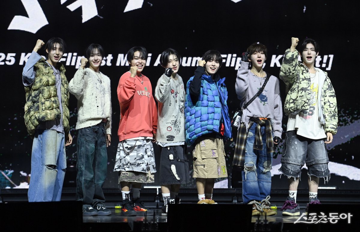 JYP의 신인 보이그룹 킥플립(KickFlip)이 20일 서울 광진구 예스24 라이브홀에서 열린 데뷔 앨범 ‘Flip it, Kick it(플립 잇, 킥 잇!)’ 발매 쇼케이스에서 포토타임을 갖고 있다. 김종원 기자 won@donga.com