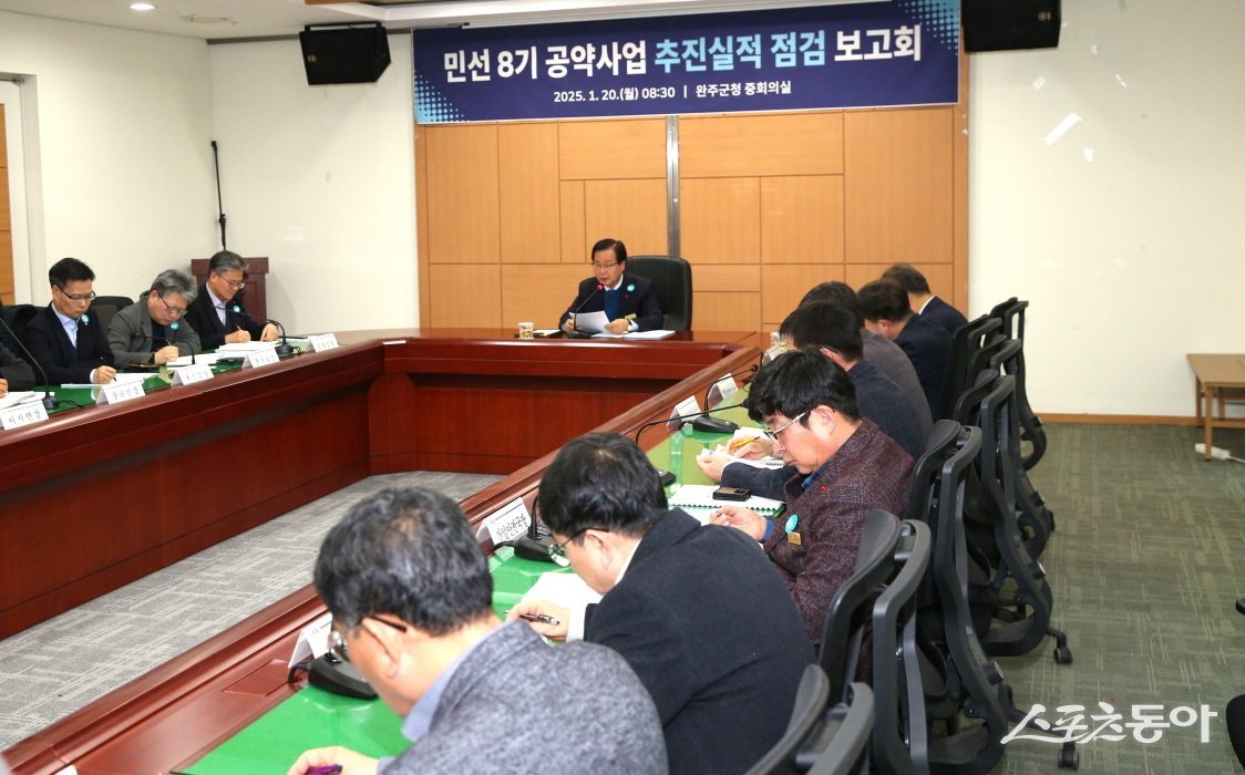 유희태 완주군수가 20일 민선 8기 공약사업 추진실적 점검 보고회를 주재하고 있다. 사진제공=완주군