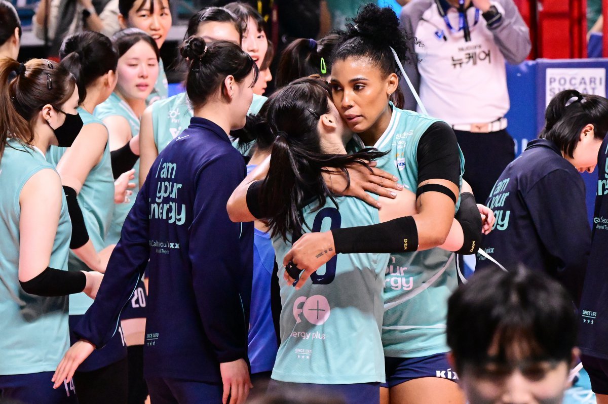 GS칼텍스 실바와 유서연이 19일 장충체육관에서 열린 페퍼저축은행과 홈경기에서 승리한 뒤 서로를 안아주며 기쁨을 나누고 있다. 사진제공|KOVO