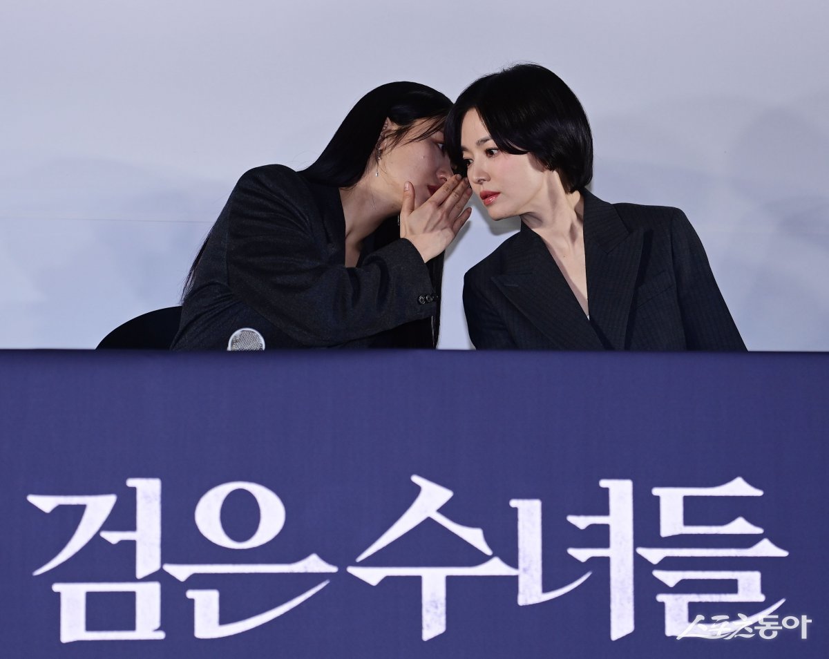 배우 전여빈과 송혜교가 20일 서울 강남구 메가박스 코엑스점에서 열린 영화 ‘검은 수녀들’ 언론시사회에 참석해 이야기를 하고 있다. 주현희 기자 teth1147@donga.com