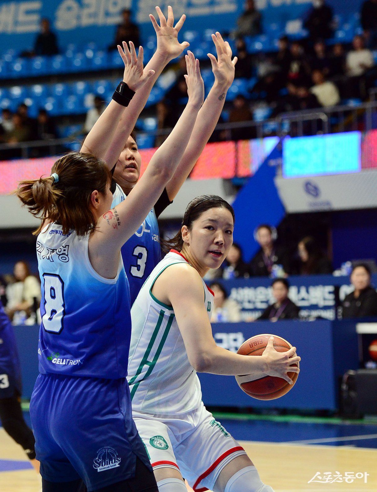 20일 인천 도원체육관에서 열린 ‘하나은행 2024-2025 여자프로농구’ 인천 신한은행과 부천 하나은행의 경기에서 하나은행 양인영이 신한은행 수비에 막혀 패스를 시도하고 있다. 인천 | 김민성 기자 marineboy@donga.com
