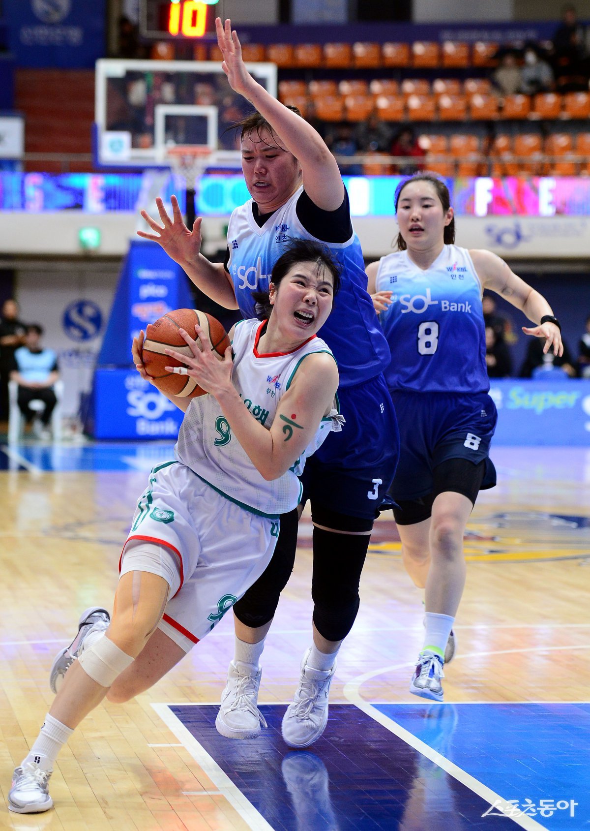 20일 인천 도원체육관에서 열린 ‘하나은행 2024-2025 여자프로농구’ 인천 신한은행과 부천 하나은행의 경기에서 하나은행 김시온이 신한은행 타니무라 리카의 수비를 제치며 돌파하고 있다. 인천 | 김민성 기자 marineboy@donga.com