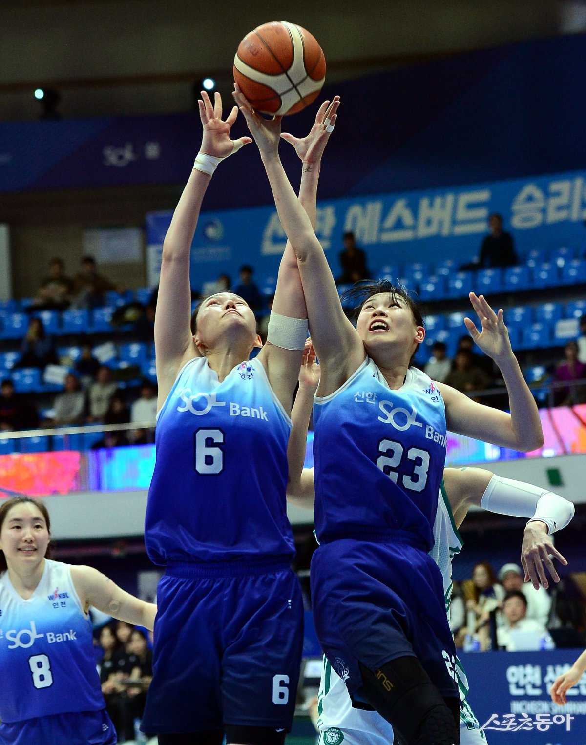 20일 인천 도원체육관에서 열린 ‘하나은행 2024-2025 여자프로농구’ 인천 신한은행과 부천 하나은행의 경기에서 신한은행 최이샘과 홍유순이 리바운드를 잡고 있다. 인천 | 김민성 기자 marineboy@donga.com