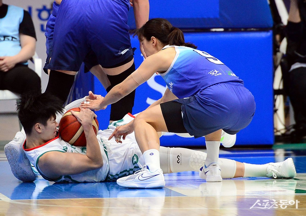 20일 인천 도원체육관에서 열린 ‘하나은행 2024-2025 여자프로농구’ 인천 신한은행과 부천 하나은행의 경기에서 하나은행 진안이 신한은행 이경은과 볼 다툼을 벌이고 있다. 인천 | 김민성 기자 marineboy@donga.com