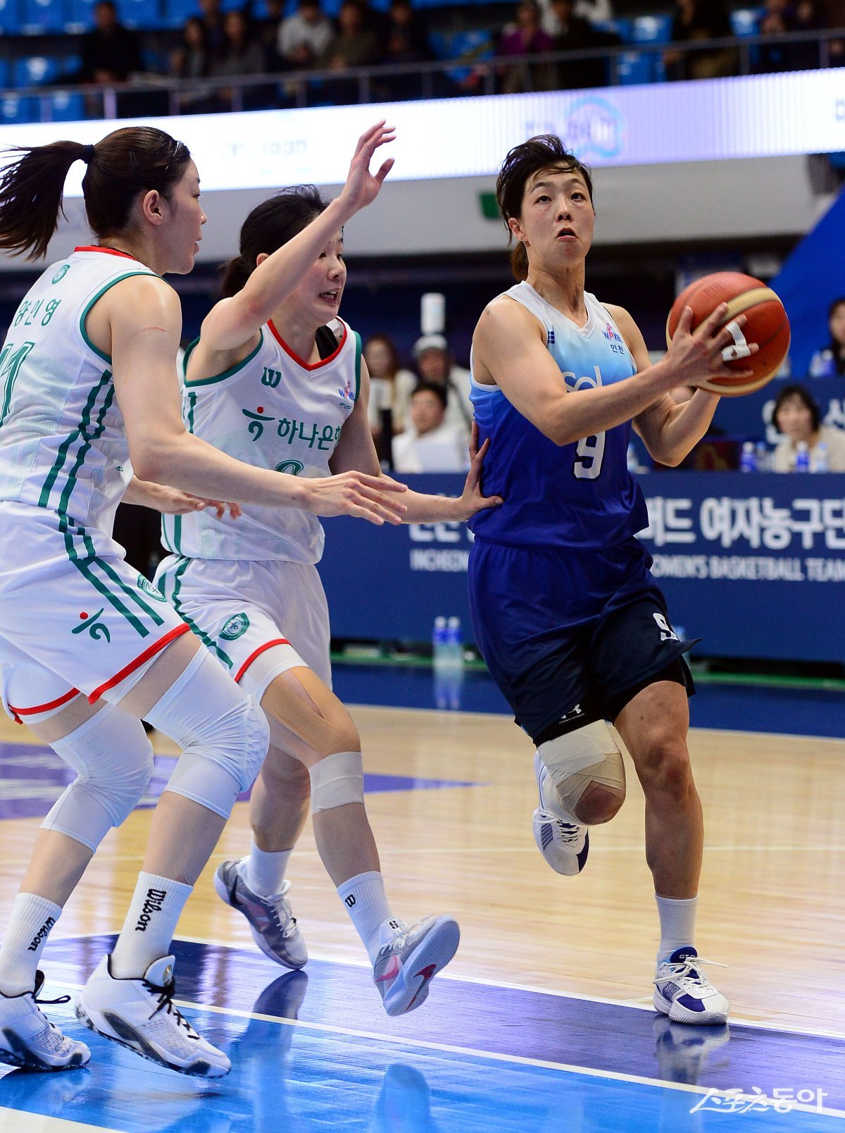20일 인천 도원체육관에서 열린 ‘하나은행 2024-2025 여자프로농구’ 인천 신한은행과 부천 하나은행의 경기에서 신한은행 이경은이 하나은행 수비를 제치며 돌파하고 있다. 인천 | 김민성 기자 marineboy@donga.com