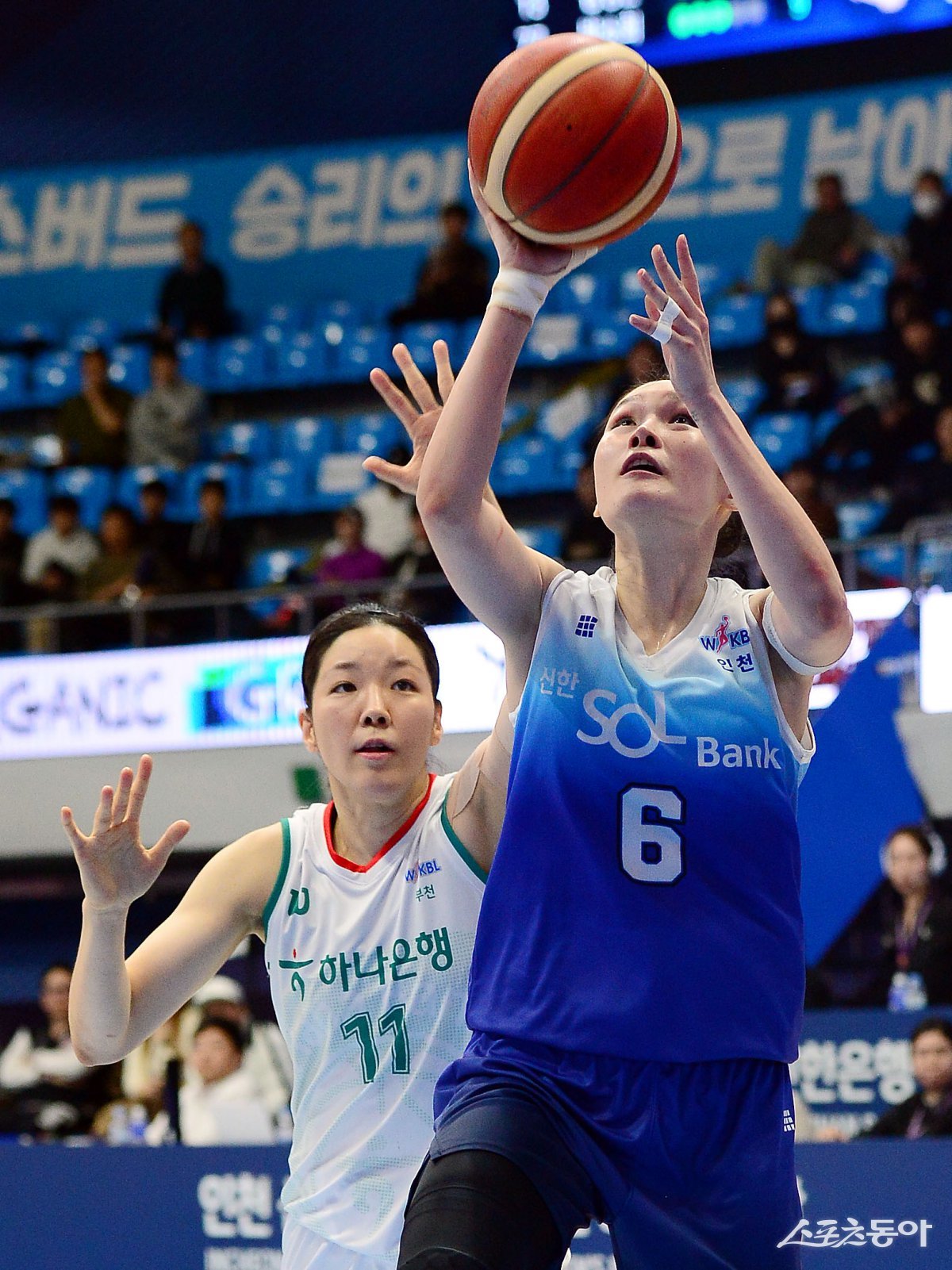 20일 인천 도원체육관에서 열린 ‘하나은행 2024-2025 여자프로농구’ 인천 신한은행과 부천 하나은행의 경기에서 신한은행 최이샘이 하나은행 양인영의 수비를 제치며 슛을 쏘고 있다. 인천 | 김민성 기자 marineboy@donga.com