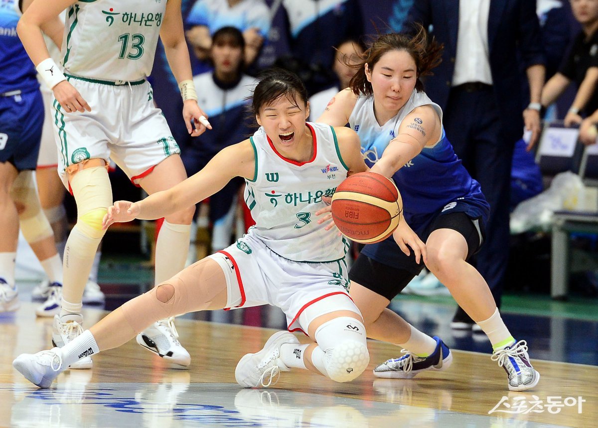 20일 인천 도원체육관에서 열린 ‘하나은행 2024-2025 여자프로농구’ 인천 신한은행과 부천 하나은행의 경기에서 신한은행 김지영과 하나은행 정예림이 볼 다툼을 벌이고 있다. 인천 | 김민성 기자 marineboy@donga.com