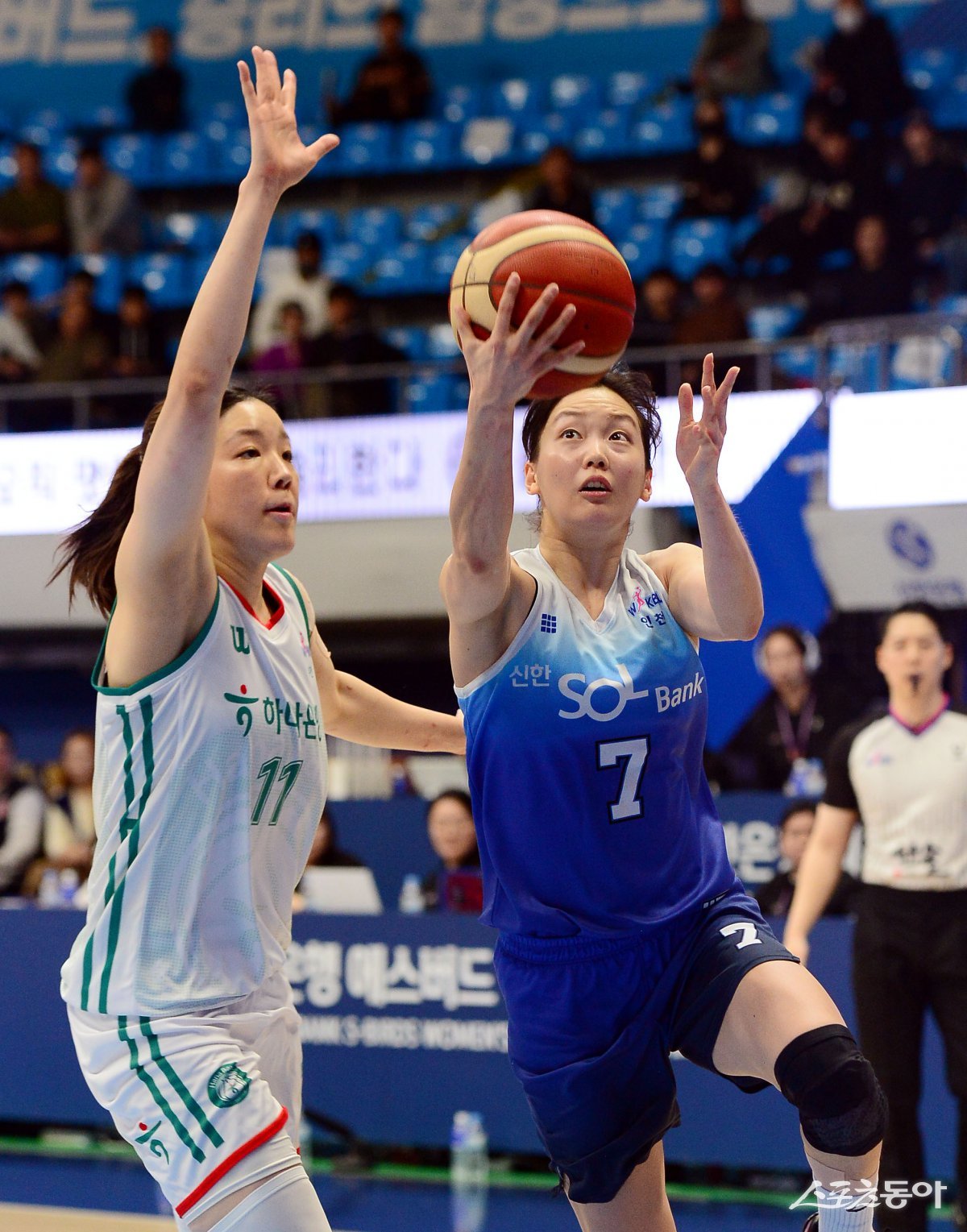 20일 인천 도원체육관에서 열린 ‘하나은행 2024-2025 여자프로농구’ 인천 신한은행과 부천 하나은행의 경기에서 신한은행 신지현이 하나은행 양인영의 수비를 피해 슛을 쏘고 있다. 인천 | 김민성 기자 marineboy@donga.com