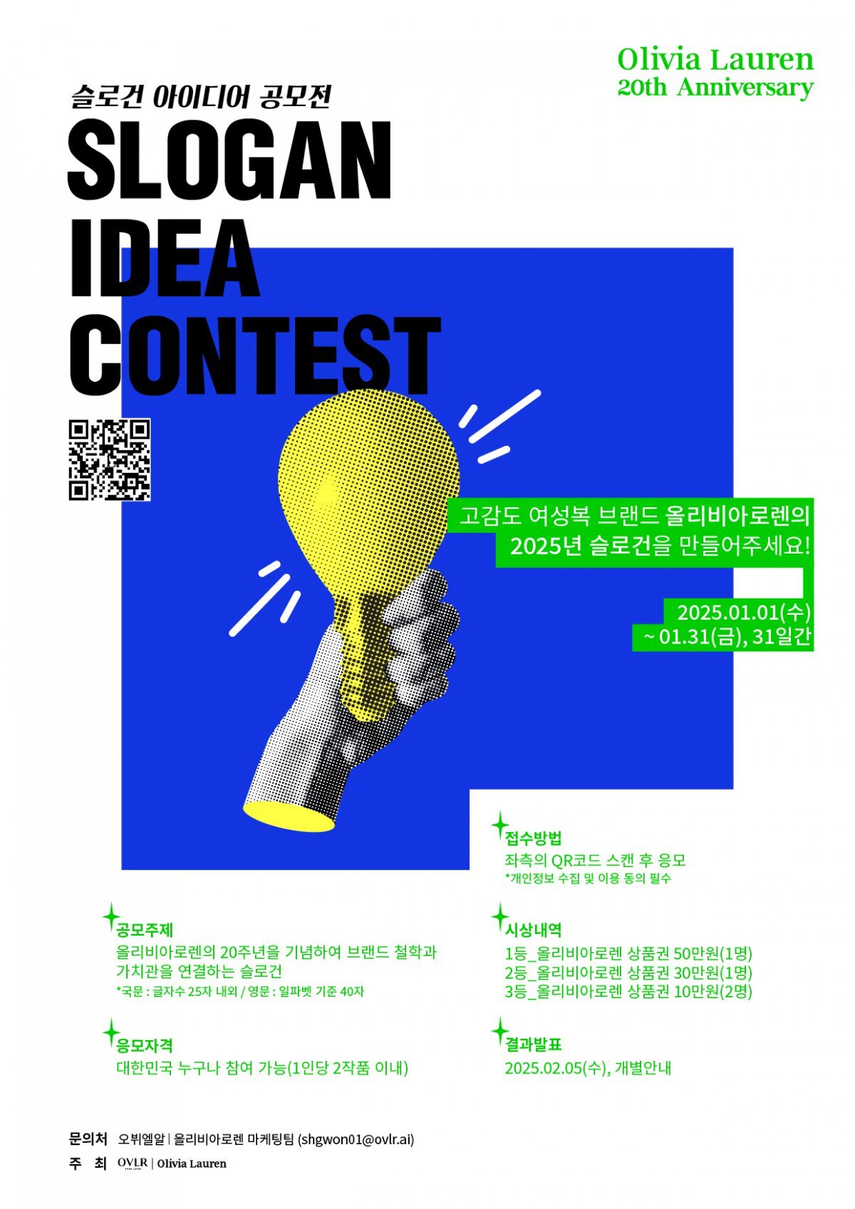 세정 자회사 OVLR의 올리비아로렌이 31일까지 론칭 20주년 기념 ‘슬로건 아이디어 공모전’(사진)을 연다.