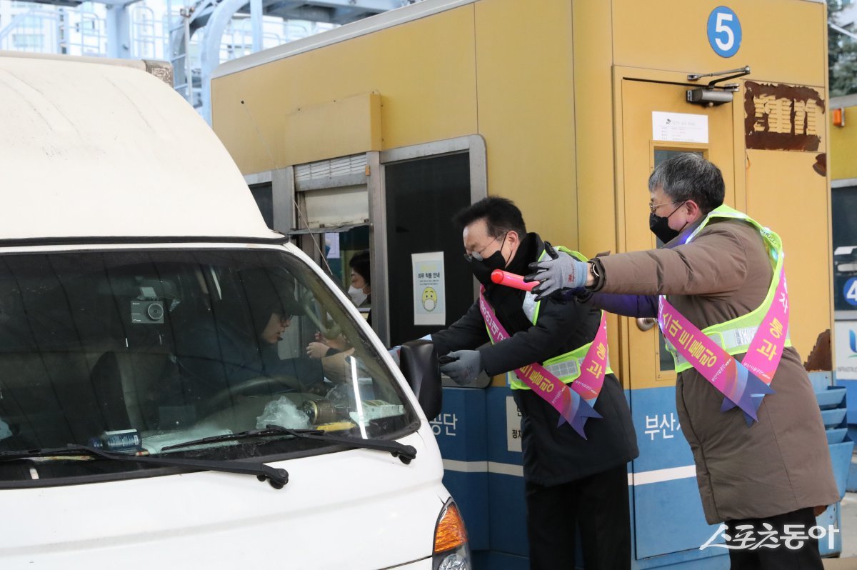 이성림 이사장(중앙)과 박태웅 도시기반본부장(우측)이 지난 20일 오전7시30분 수영강변요금소에서 운전자에게 스마트톨링 안내문과 홍보기념품을 직접전달하고 있다. (사진제공=부산시설공단)