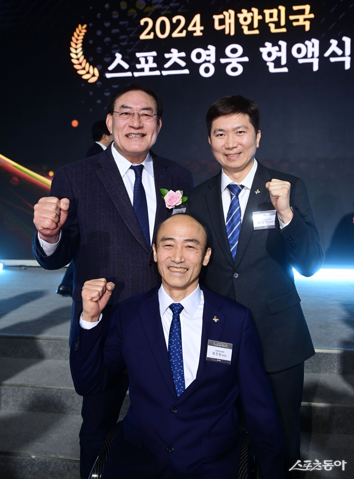하형주 국민체육진흥공단 이사장, 유승민 대한체육회장, 정진완 대한장애인체육회장(왼쪽 윗줄에서 시계 방향으로)이 21일 서울 송파구 방이동 올림픽파크텔 올림피아홀에서 열린 ‘2024 대한민국 스포츠영웅 헌액식’에 참석해 기념 촬영을 하고 있다. 주현희 기자 teth1147@donga.com