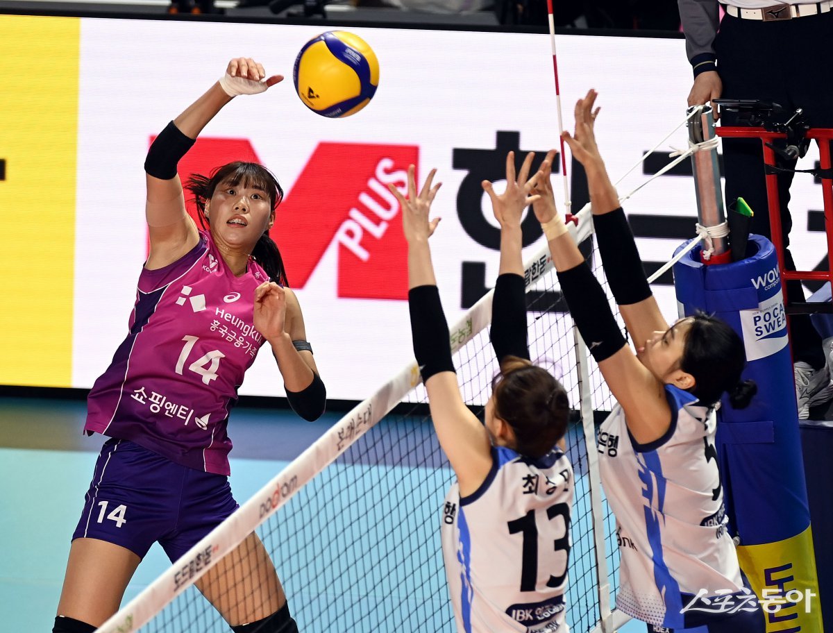 21일 인천 삼산월드체육관에서 ‘도드람 2024-2025 V리그’ 흥국생명과 IBK기업은행의 여자부 경기가 열렸다. 흥국생명 정윤주가 IBK기업은행 블로커를 피해 공격을 펼치고 있다. 인천 | 김민성 기자 marineboy@donga.com