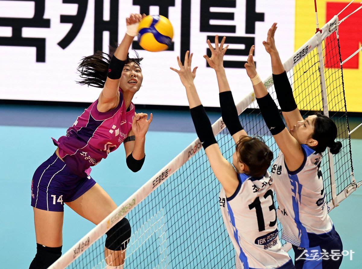 21일 인천 삼산월드체육관에서 ‘도드람 2024-2025 V리그’ 흥국생명과 IBK기업은행의 여자부 경기가 열렸다. 흥국생명 정윤주가 IBK기업은행 블로커를 피해 스파이크를 날리고 있다. 인천 | 김민성 기자 marineboy@donga.com