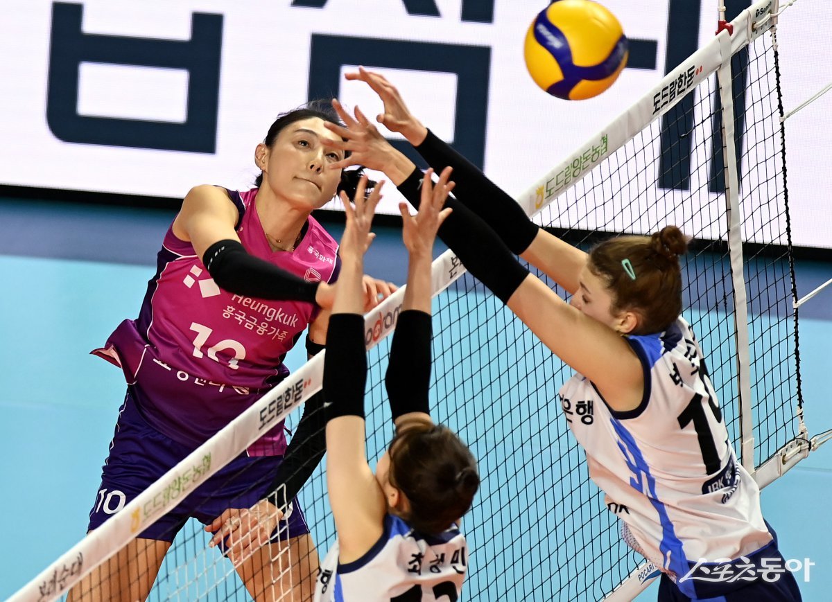 21일 인천 삼산월드체육관에서 ‘도드람 2024-2025 V리그’ 흥국생명과 IBK기업은행의 여자부 경기가 열렸다. 흥국생명 김연경이 IBK기업은행 블로커를 피해 스파이크를 날리고 있다. 인천 | 김민성 기자 marineboy@donga.com