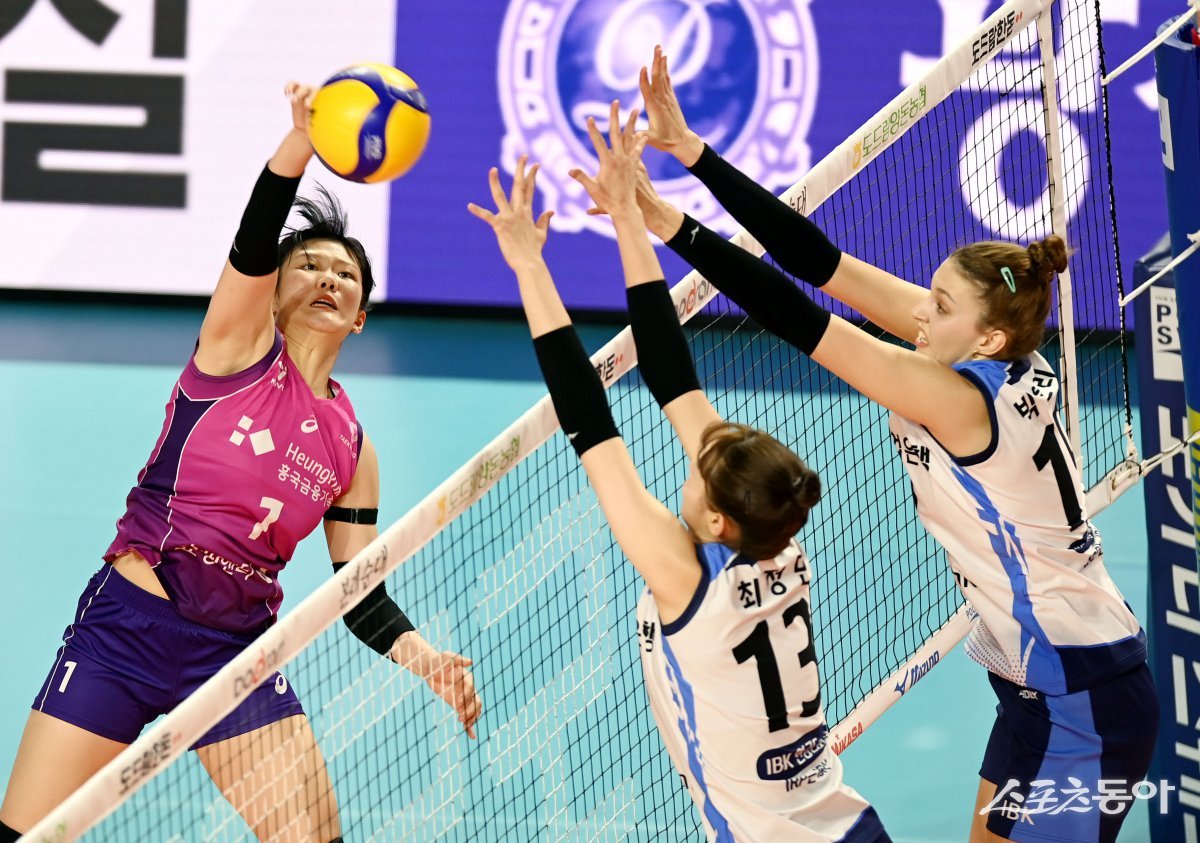 21일 인천 삼산월드체육관에서 ‘도드람 2024-2025 V리그’ 흥국생명과 IBK기업은행의 여자부 경기가 열렸다. 흥국생명 김다은이 IBK기업은행 블로커를 피해 스파이크를 날리고 있다. 인천 | 김민성 기자 marineboy@donga.com
