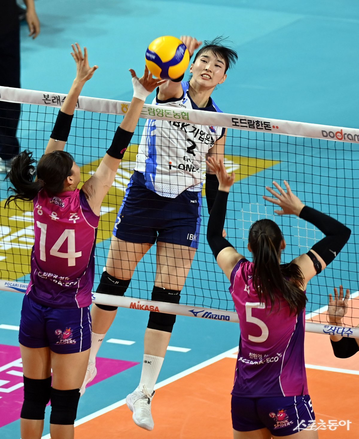 21일 인천 삼산월드체육관에서 ‘도드람 2024-2025 V리그’ 흥국생명과 IBK기업은행의 여자부 경기가 열렸다. IBK기업은행 이주아가 흥국생명 블로커를 피해 공격을 펼치고 있다. 인천 | 김민성 기자 marineboy@donga.com
