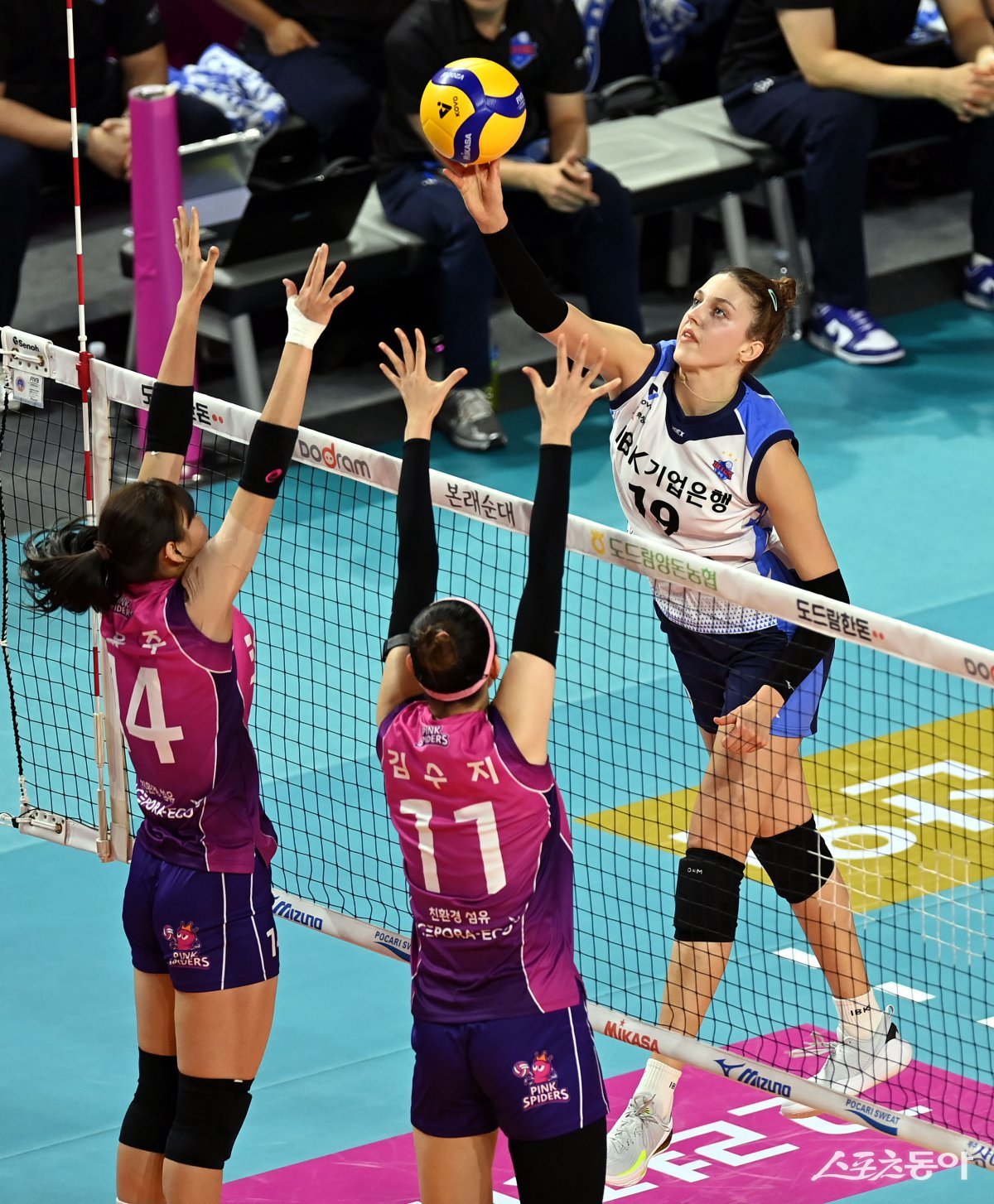 21일 인천 삼산월드체육관에서 ‘도드람 2024-2025 V리그’ 흥국생명과 IBK기업은행의 여자부 경기가 열렸다. IBK기업은행 빅토리아가 흥국생명 블로커를 피해 공격을 펼치고 있다. 인천 | 김민성 기자 marineboy@donga.com