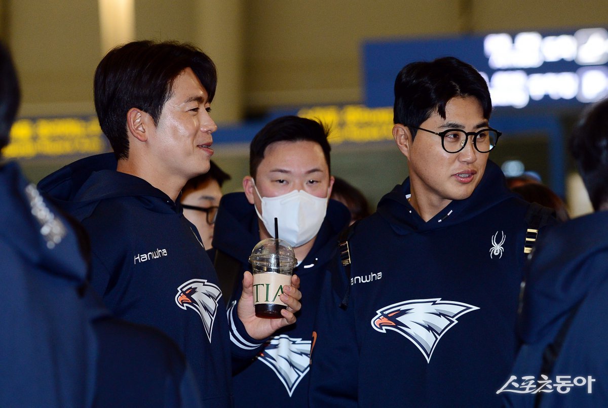 한화 이글스가 2025시즌 스프링캠프를 위해 22일 인천국제공항을 통해 호주 멜버른으로 출국했다. 출국에 앞서 한화 이태양, 안치홍, 채은성이 이야기를 나누고 있다. 인천국제공항 | 김민성 기자 marineboy@donga.com