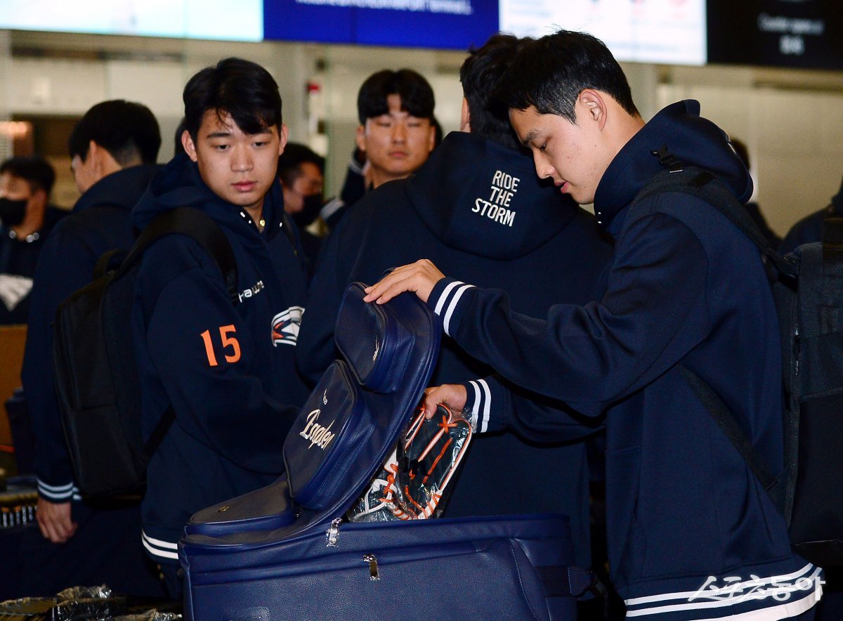 한화 이글스가 2025시즌 스프링캠프를 위해 22일 인천국제공항을 통해 호주 멜버른으로 출국했다. 한화 문동주가 글러브를 챙기고 있다. 인천국제공항 | 김민성 기자 marineboy@donga.com
