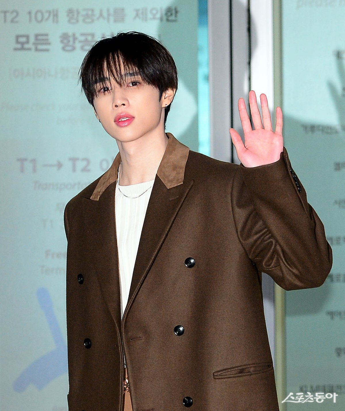 더보이즈 선우가 해외일정 참석차 22일 인천공항을 통해 프랑스 파리로 출국에 앞서 포즈를 취하고 있다. 인천국제공항 | 김민성 기자 marineboy@donga.com