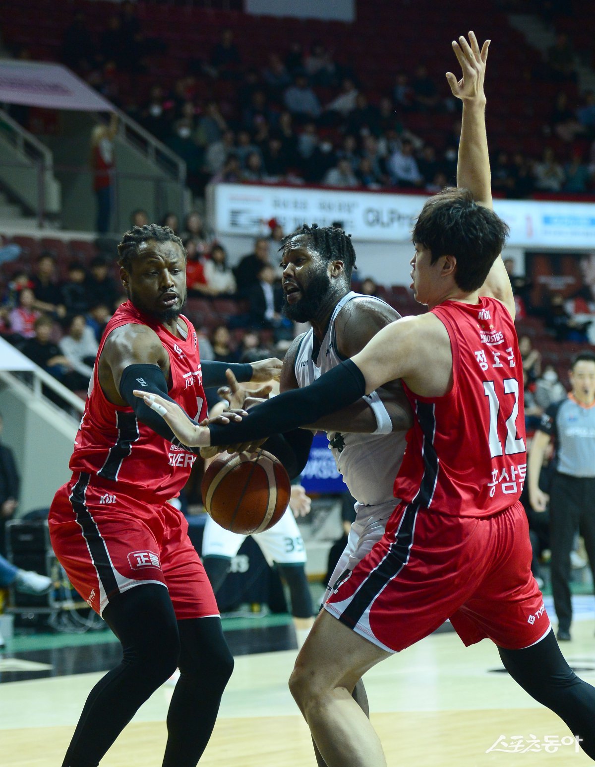 22일 안양 정관장 아레나에서 열린 ‘2024-2025 프로농구’ 정관장과 DB 경기에서 DB 카터가 정관장의 수비를 뚫고 골밑을 공격하고 있다. 안양|김종원 기자 won@donga.com