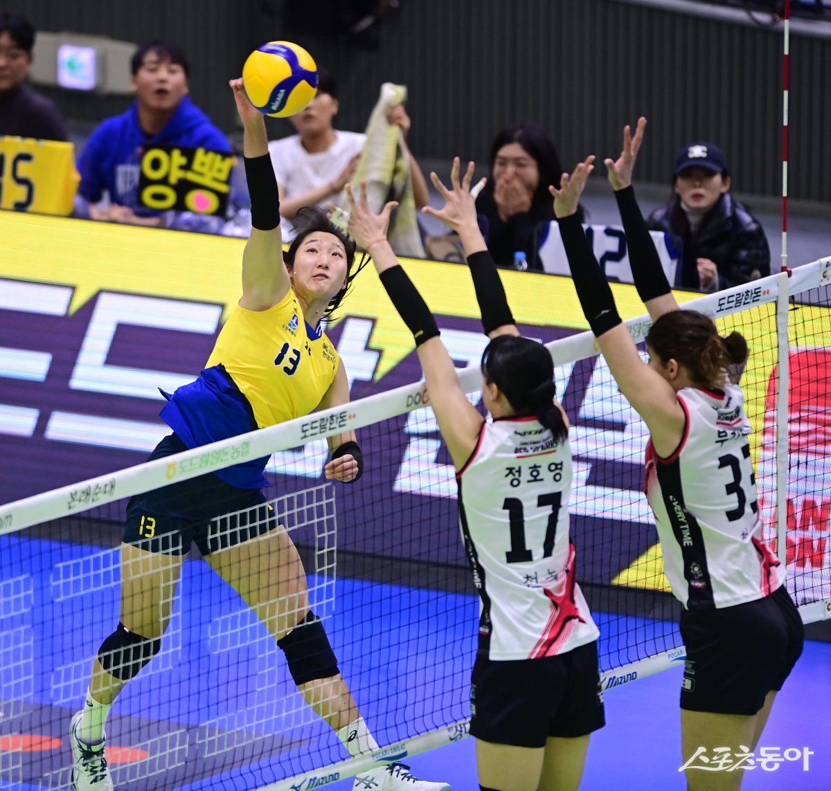 22일 경기 수원체육관에서 열린 ‘도드람 2024-2025 V리그’ 여자부 현대건설과 정관장의 경기에서 현대건설 정지윤이 정관장 블로커 앞에서 스파이크를 하고 있다. 수원 | 주현희 기자 teth1147@donga.com