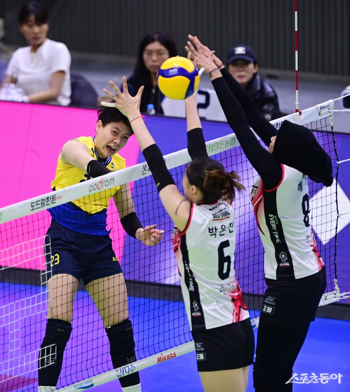 22일 경기 수원체육관에서 열린 ‘도드람 2024-2025 V리그’ 여자부 현대건설과 정관장의 경기에서 현대건설 위파위가 정관장 블로커 앞에서 스파이크를 하고 있다. 수원 | 주현희 기자 teth1147@donga.com