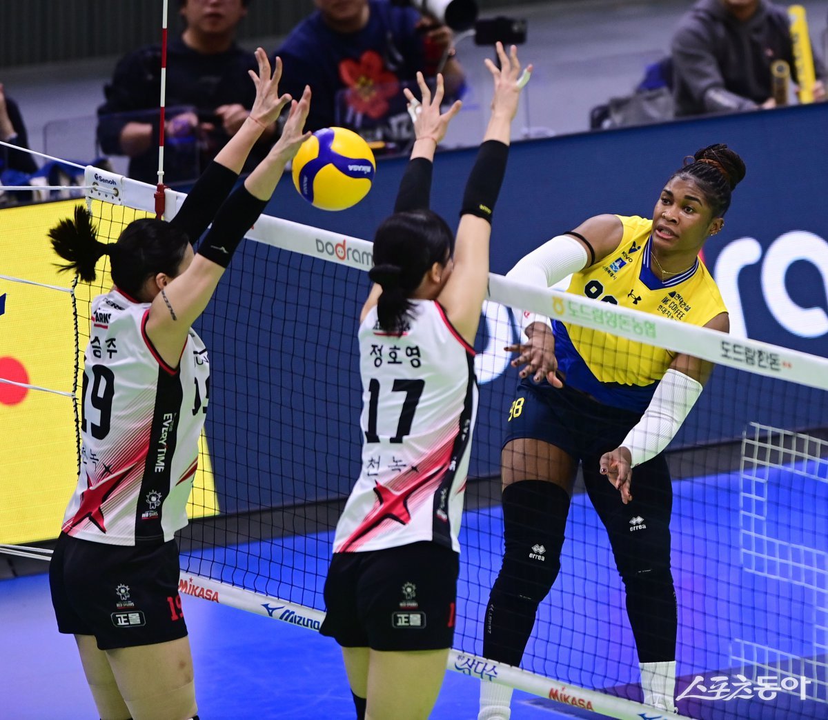 22일 경기 수원체육관에서 열린 ‘도드람 2024-2025 V리그’ 여자부 현대건설과 정관장의 경기에서 현대건설 모마가 정관장 블로커 앞에서 스파이크를 하고 있다. 수원 | 주현희 기자 teth1147@donga.com