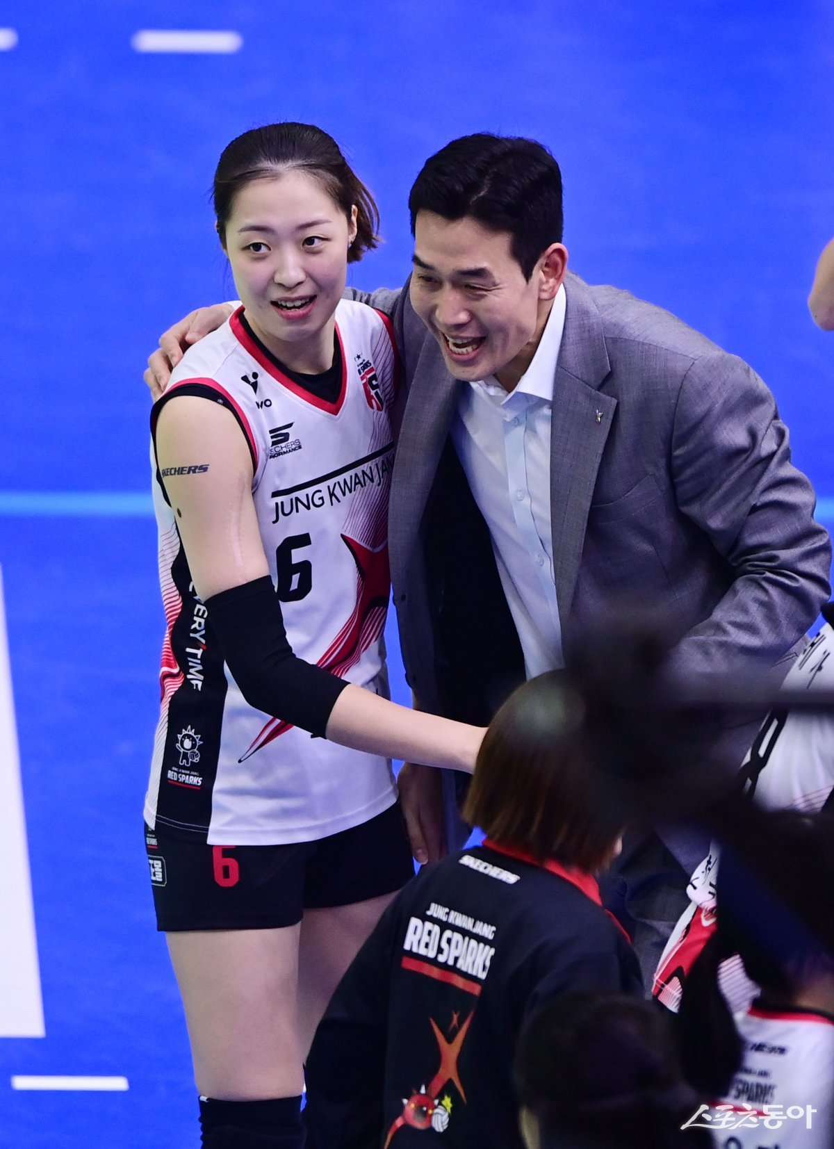 22일 경기 수원체육관에서 열린 ‘도드람 2024-2025 V리그’ 여자부 현대건설과 정관장의 경기에서 정관장 고희진 감독이 박은진을 격려하고 있다. 수원 | 주현희 기자 teth1147@donga.com