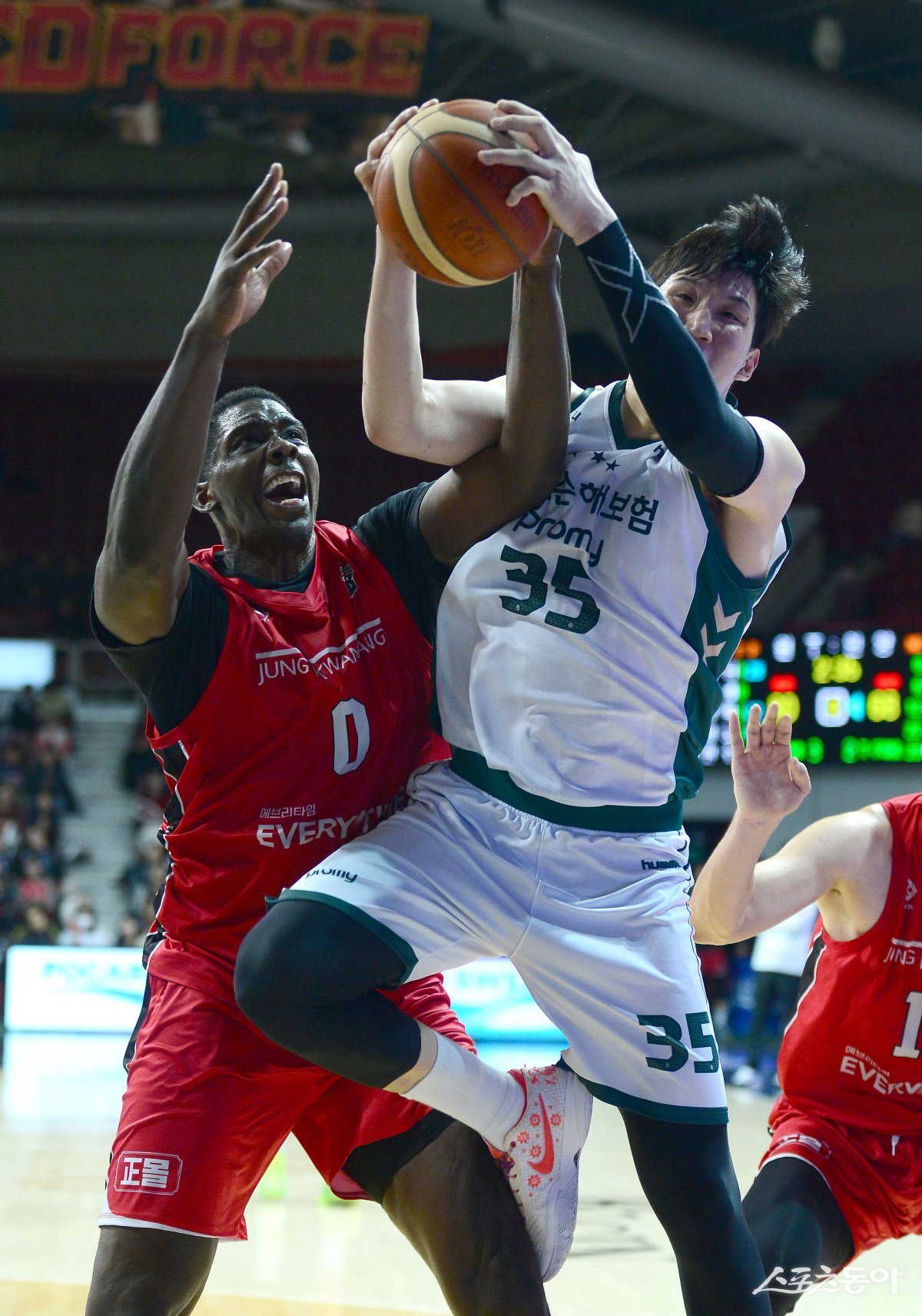 22일 안양 정관장 아레나에서 열린 ‘2024-2025 프로농구’ 정관장과 DB 경기에서 DB 서민수와 정관장 오브라이언트가 리바운드 볼을 다투고 있다. 안양|김종원 기자 won@donga.com