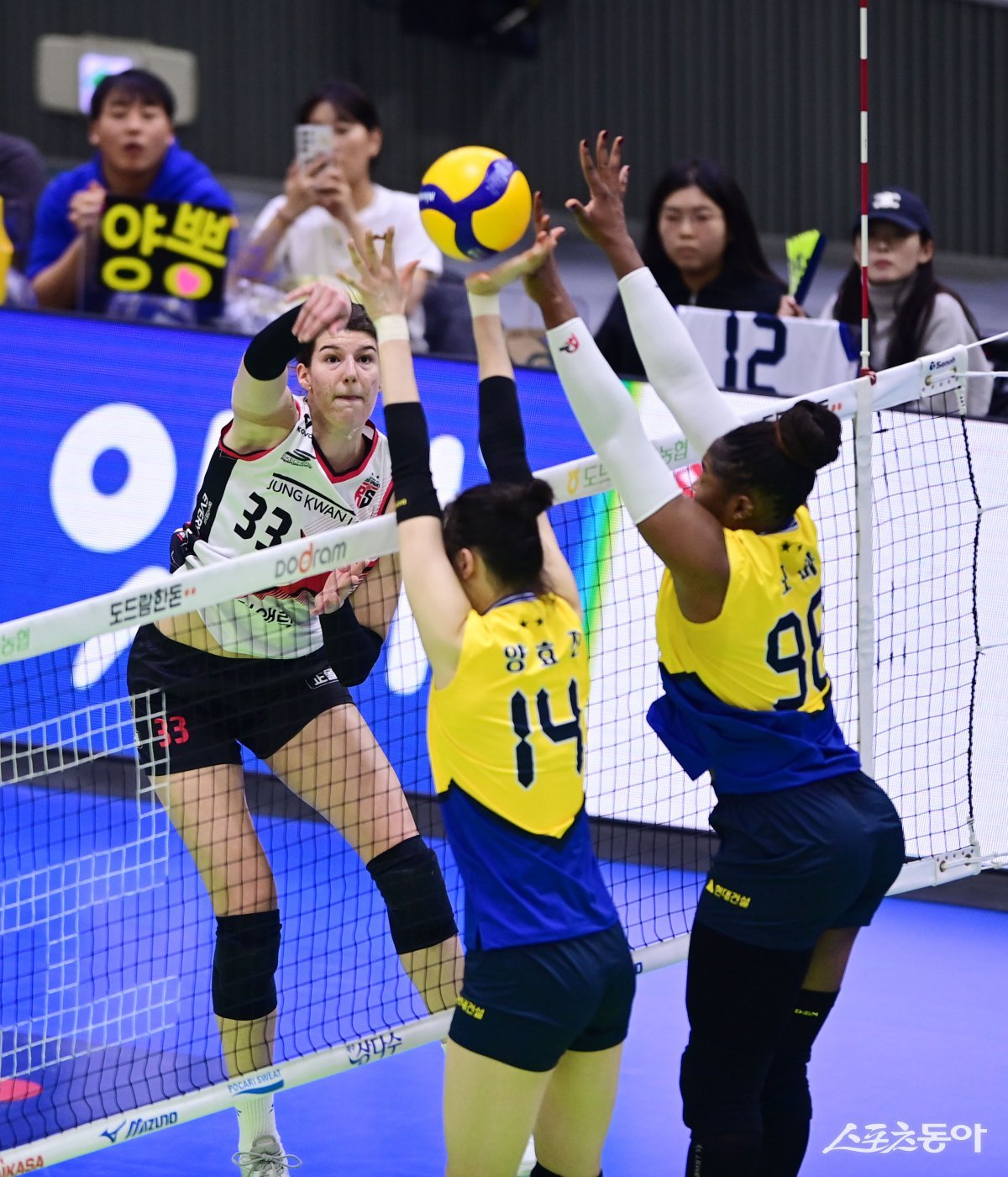 22일 경기 수원체육관에서 열린 ‘도드람 2024-2025 V리그’ 여자부 현대건설과 정관장의 경기에서 정관장 부키리치가 현대건설 블로커 앞에서 스파이크를 하고 있다. 수원 | 주현희 기자 teth1147@donga.com