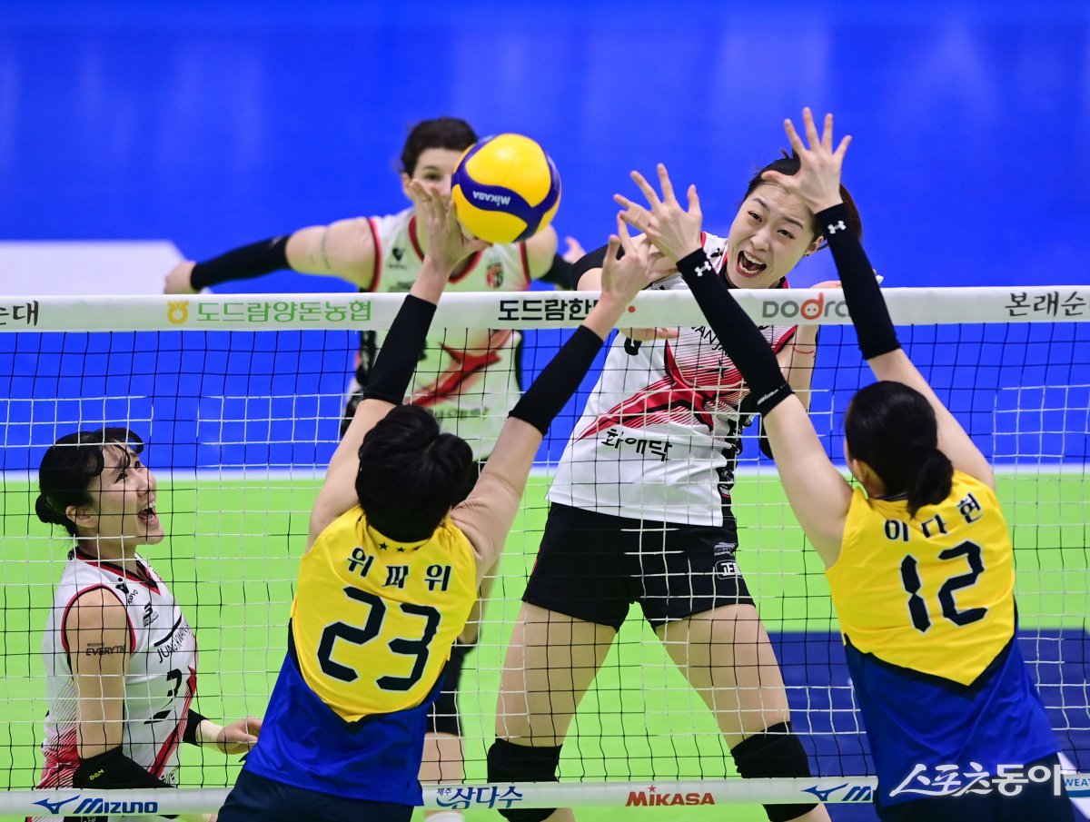 22일 경기 수원체육관에서 열린 ‘도드람 2024-2025 V리그’ 여자부 현대건설과 정관장의 경기에서 정관장 박은진이 현대건설 블로커 앞에서 스파이크를 하고 있다. 수원 | 주현희 기자 teth1147@donga.com