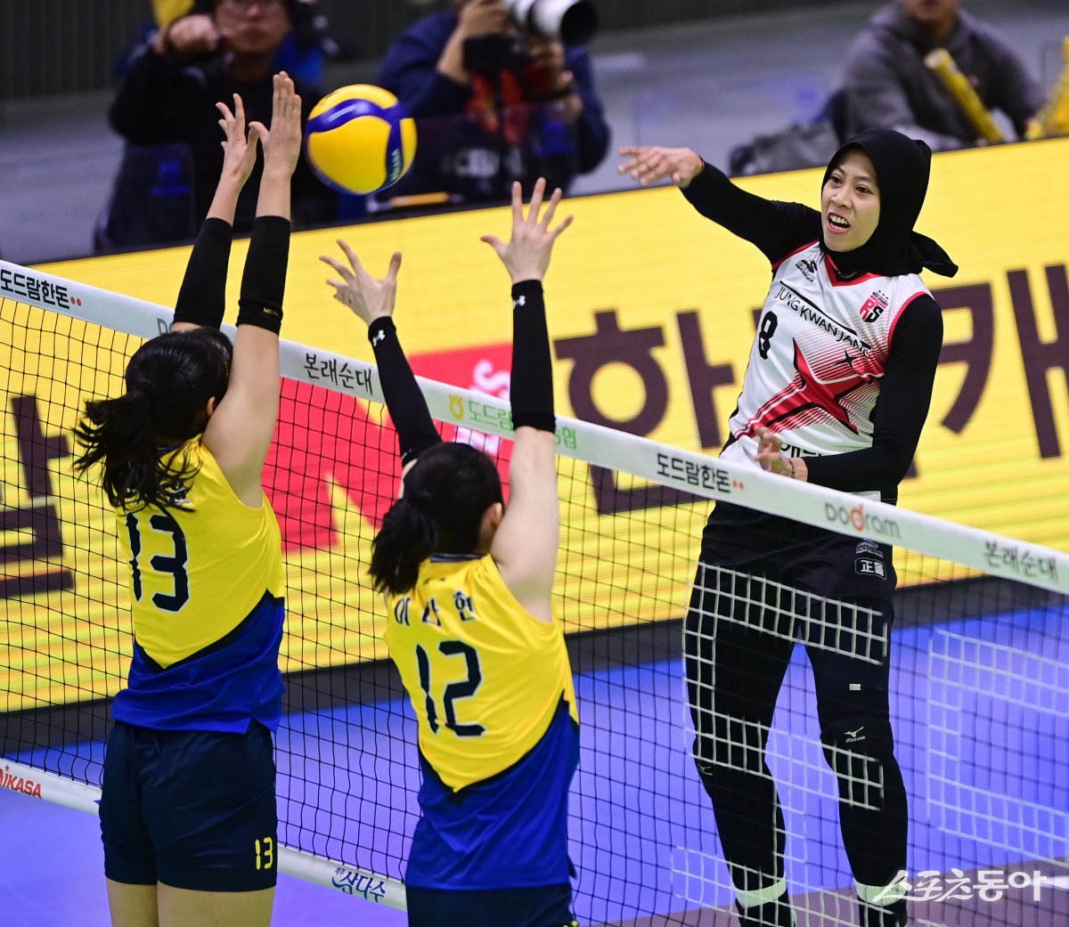 22일 경기 수원체육관에서 열린 ‘도드람 2024-2025 V리그’ 여자부 현대건설과 정관장의 경기에서 정관장 메가가 현대건설 블로커 앞에서 스파이크를 하고 있다. 수원 | 주현희 기자 teth1147@donga.com