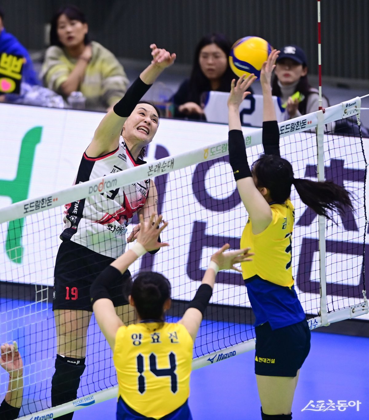 22일 경기 수원체육관에서 열린 ‘도드람 2024-2025 V리그’ 여자부 현대건설과 정관장의 경기에서 정관장 표승주가 현대건설 블로커 앞에서 스파이크를 하고 있다. 수원 | 주현희 기자 teth1147@donga.com