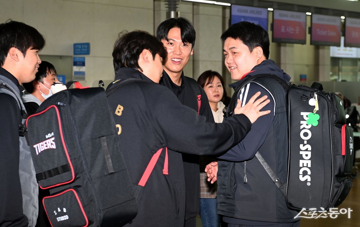 LG 트윈스가 23일 인천국제공항을 통해 2025시즌 스프링캠프가 열리는 미국으로 출국한다. LG와 FA 계약을 맺은 장현식이 KIA 선수들과 인사를 나누고 있다. 인천국제공항 | 김민성 기자 marineboy@donga.com