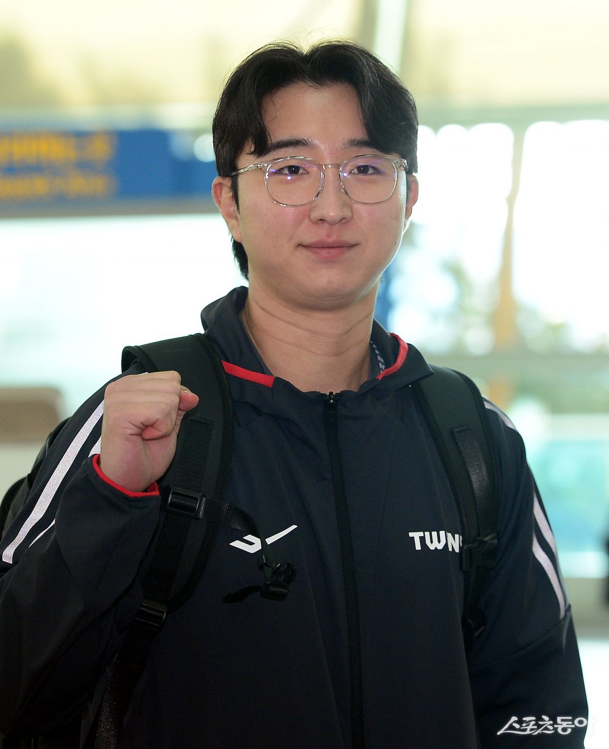 LG 트윈스가 23일 인천국제공항을 통해 2025시즌 스프링캠프가 열리는 미국으로 출국한다. 출국에 앞서 LG 최채흥이 카메라를 향해 포즈를 취하고 있다. 인천국제공항 | 김민성 기자 marineboy@donga.com