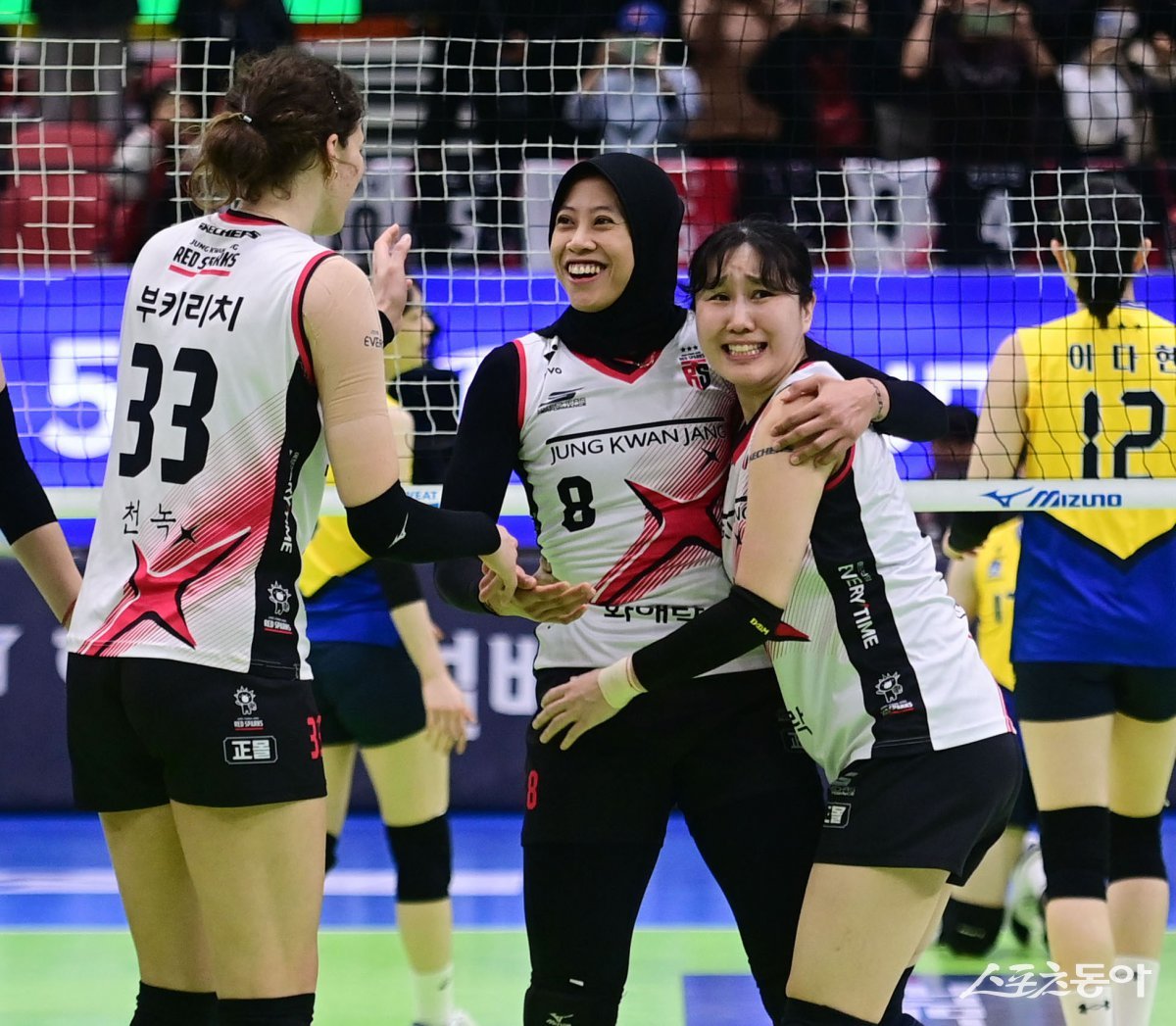 정관장 메가(가운데)가 22일 수원체육관에서 열린 현대건설과 원정경기를 승리로 장식한 뒤 동료들과 기쁨을 나누고 있다. 수원|주현희 기자 teth1147@donga.com