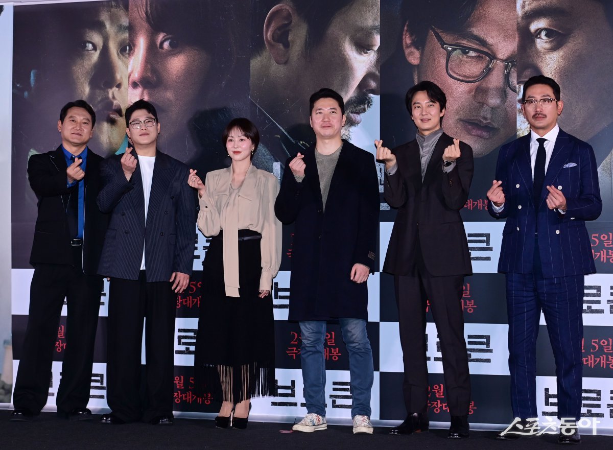 배우 정만식, 임성재, 유다인, 김진황 감독, 김남길, 하정우가 23일 서울 용산구 CGV용산아이파크몰점에서 열린 영화 ‘브로큰’ 언론시사회에 참석해 포즈를 취하고 있다. 주현희 기자 teth1147@donga.com