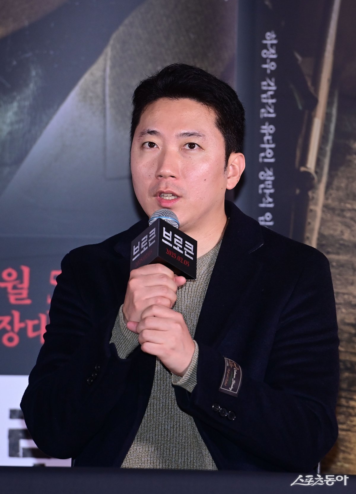 김진황 감독이 23일 서울 용산구 CGV용산아이파크몰점에서 열린 영화 ‘브로큰’ 언론시사회에 참석해 인사말을 하고 있다. 주현희 기자 teth1147@donga.com